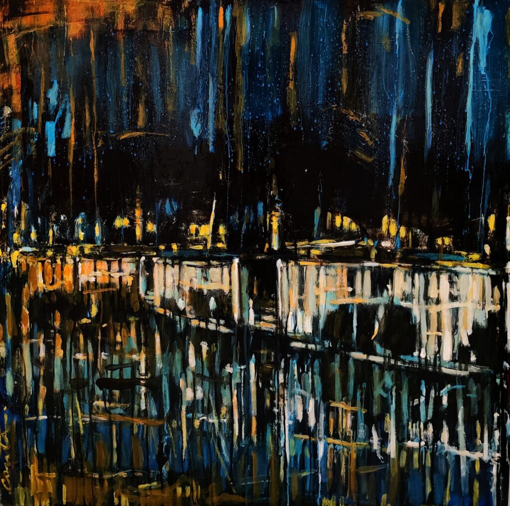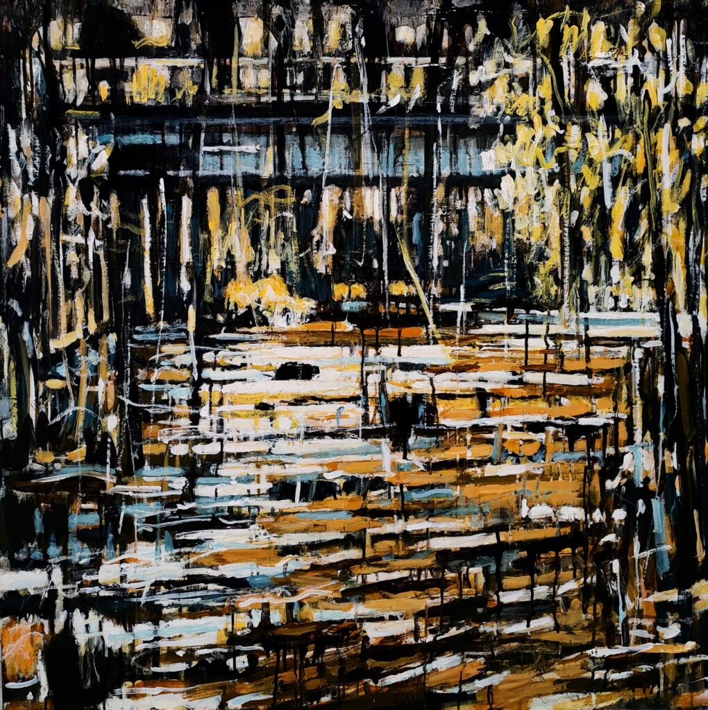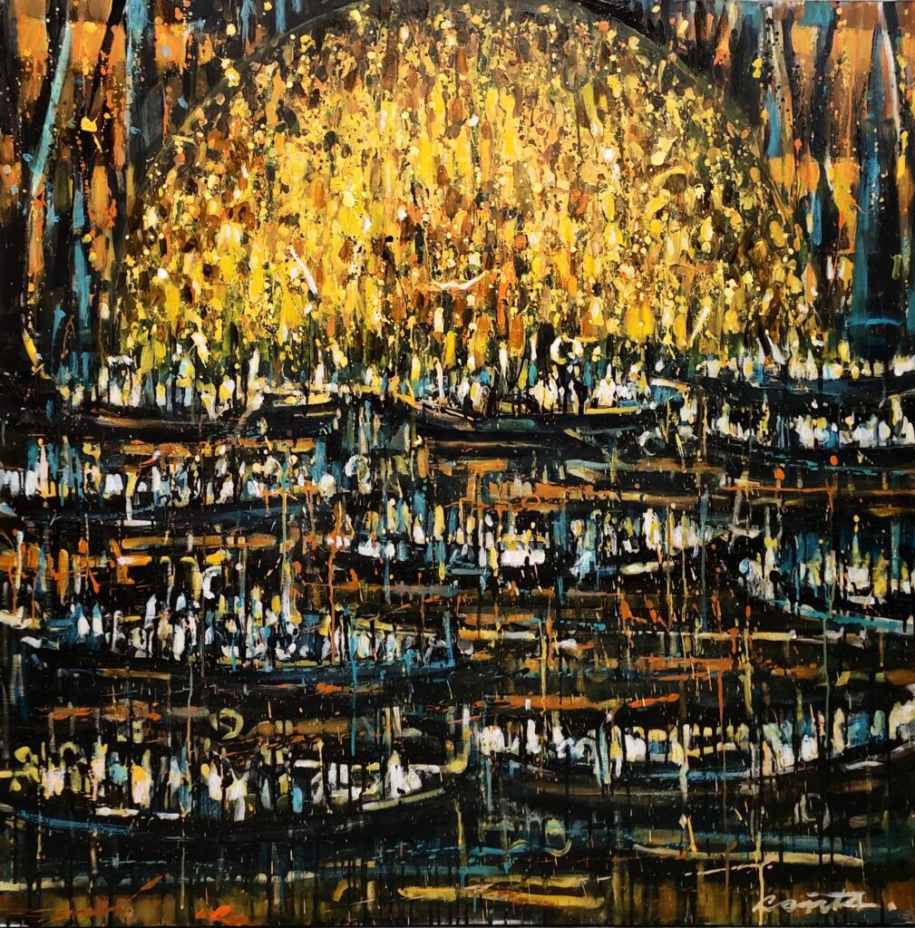Ma rivière, mes rivières, celles qui coulent dans les veines de la Normandie… Mes souvenirs d’enfant, ces parties de pêche avec mon grand-père puis avec mon père, ma barque, les anciens moulins devenant mes forteresses, mon royaume, les pêcheurs, des intrus ; La rivière était mienne, elle m’apprenait la vie, la faune, la flore, les saisons… Alors, il y a 3 ans, j’ai repris les pinceaux, j’ai décidé de lui rendre hommage notamment à travers ce moment, entre chien et loup, alors que les grenouilles se taisent progressivement, que la lune donne ses derniers reflets à l’eau, que le soleil se lève et que les couleurs jaillissent. Je marche au bord et je peins tous ces lieux de bonheur, les pontons où je passais des heures à contempler la nature, ma barque qui devenait ce bateau Viking au bord duquel je sillonnais mes rivières et où je devenais le roi du monde, le maître des lieux. Conta